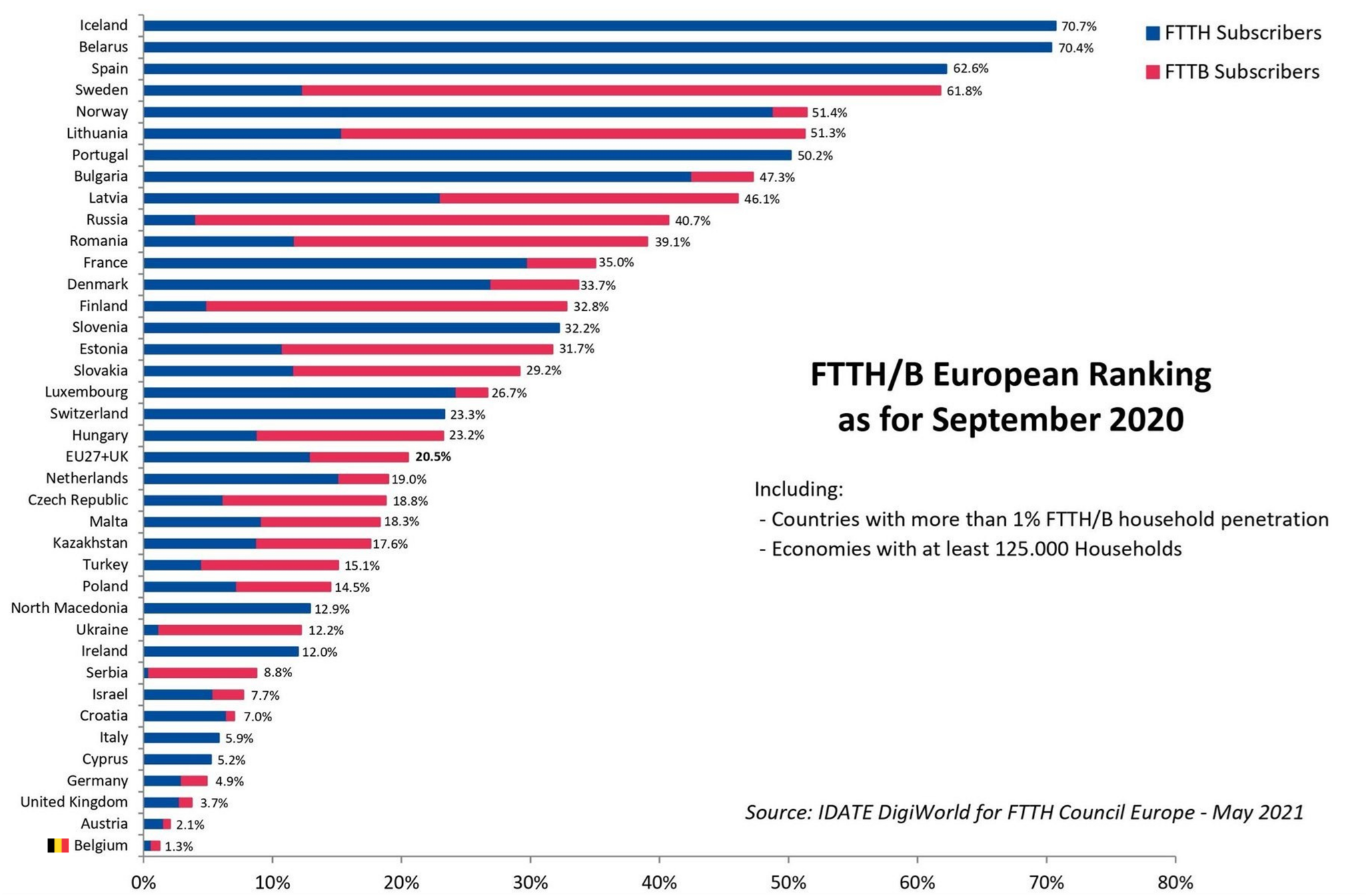 Je suis heureux de lire que la Belgique opte enfin pour le FTTH. Ce qui permet à la Belgique d’entrer dans le classement FTTH/B du "FTTH Council Europe", augmentant ses abonnés de 42% et les habitations câblées de 155% par rapport à septembre 2019.