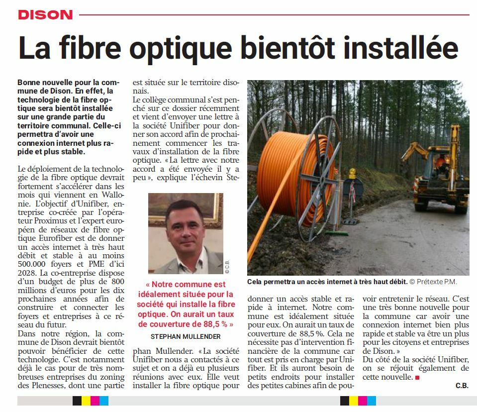 Unifiber fait de nouveau une commune positive dans la presse pour l'arrivée de la fibre pour ses citoyens ! L'administration communale de la ville de Dison s'est dite contente de voir arriver "une connexion internet bien plus rapide et stable qui sera un vrai plus pour les citoyens et entreprises de Dison".
